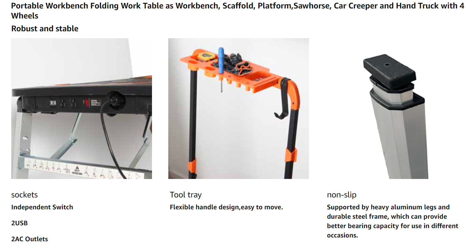 LEADALLWAY 7-in-1 Workbench Folding with Power Outlet and 33FT Long Power Cord Painted Work Table as Workbench, Scaffold,Platform,Sawhorse,Car Creeper and Hand Truck with 4 Wheels