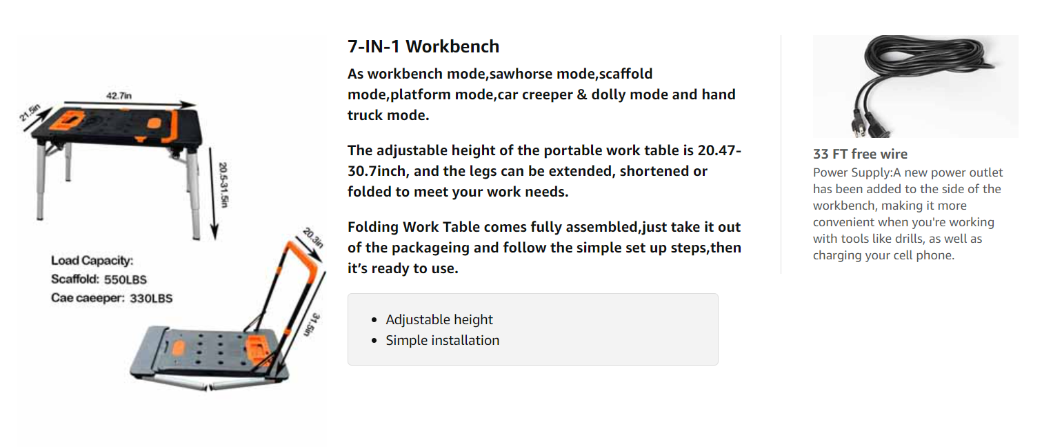 This workbench transformed my garage! It effortlessly switches between 7 modes—from assembling furniture to cutting lumber. The built-in power outlet and 33ft cord eliminated my extension cable chaos. Folded vertically, it’s a space-saving miracle for small workshops. Worth every penny!